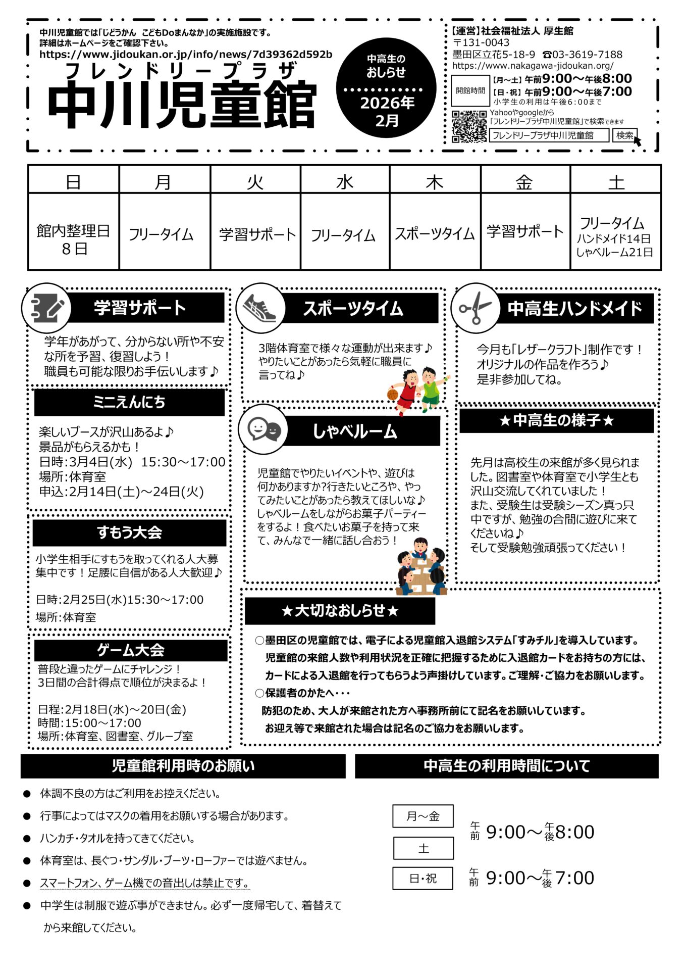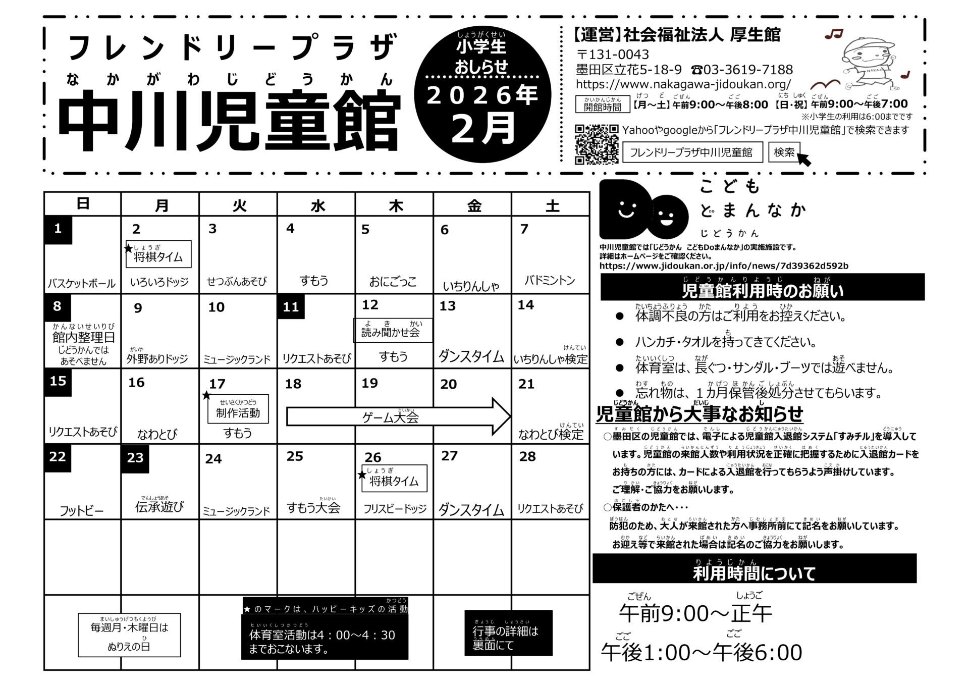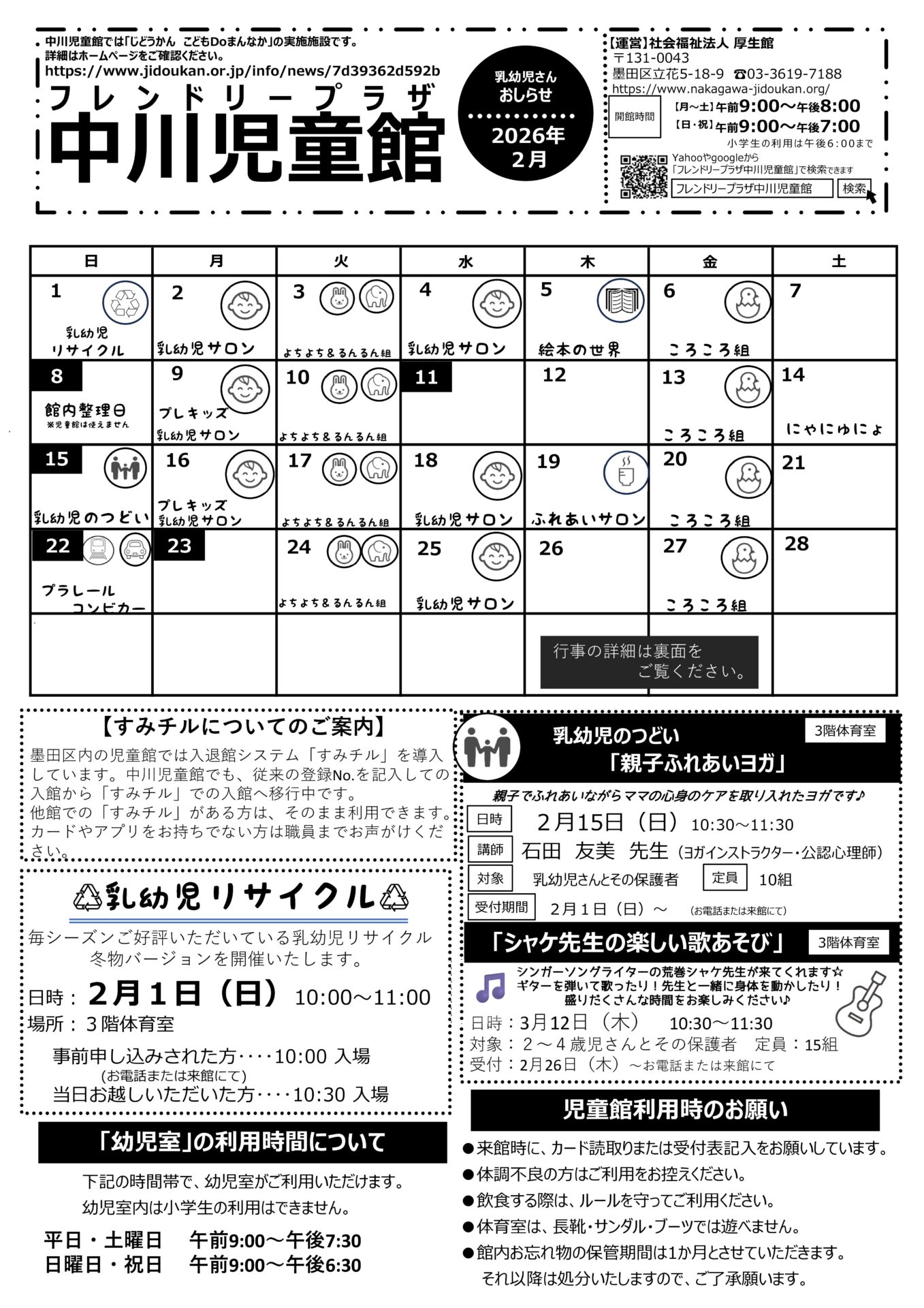 学童クラブみんなの「ただいまー」が響く場所です走っちゃだめです 図書室 まったりできますごろごろは できませんけど 体育室バスケは中高生に人気小学生男子は3歩ドッヂ女の子は一輪車かな 幼児室いろんな玩具が待っていますプーさん、ティガに、プラレールとかとか あたらしいおしらせ 2025-12-27 乳幼児リサイクル2025冬 開催について 2025-12-10 12月13日(土)観劇会を鑑賞する際のお願い 2025-11-30 12月乳幼児おたより 2025-11-19 乳幼児観劇会のお知らせ 2025-10-09 児童館遠足 開催場所についてのお知らせ 2025-07-03 小中高生 夜間イベント 当落について こんげつのおたより R7一般おたより_ティーン用 2月R7_一般おたより_小学生用_2月-01R7_一般おたより_小学生用_2月-02R7_一般おたより_乳幼児さん用_2月-01R7_一般おたより_乳幼児さん用_2月-02 クリックして X で共有 (新しいウィンドウで開きます) X Facebook で共有するにはクリックしてください (新しいウィンドウで開きます) Facebook クリックして印刷 (新しいウィンドウで開きます) 印刷 クリックして友達にメールでリンクを送信 (新しいウィンドウで開きます) メールアドレス